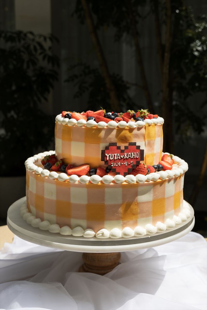 結婚証明書はかほさんの力作です!  ウエディングケーキは、スイーツが好きなゆうたさんの大好きなチョコレートケーキと、かほさんの大好きなギンガムチェックが融合した世界に一つだけの完全フルオーダーケーキ!