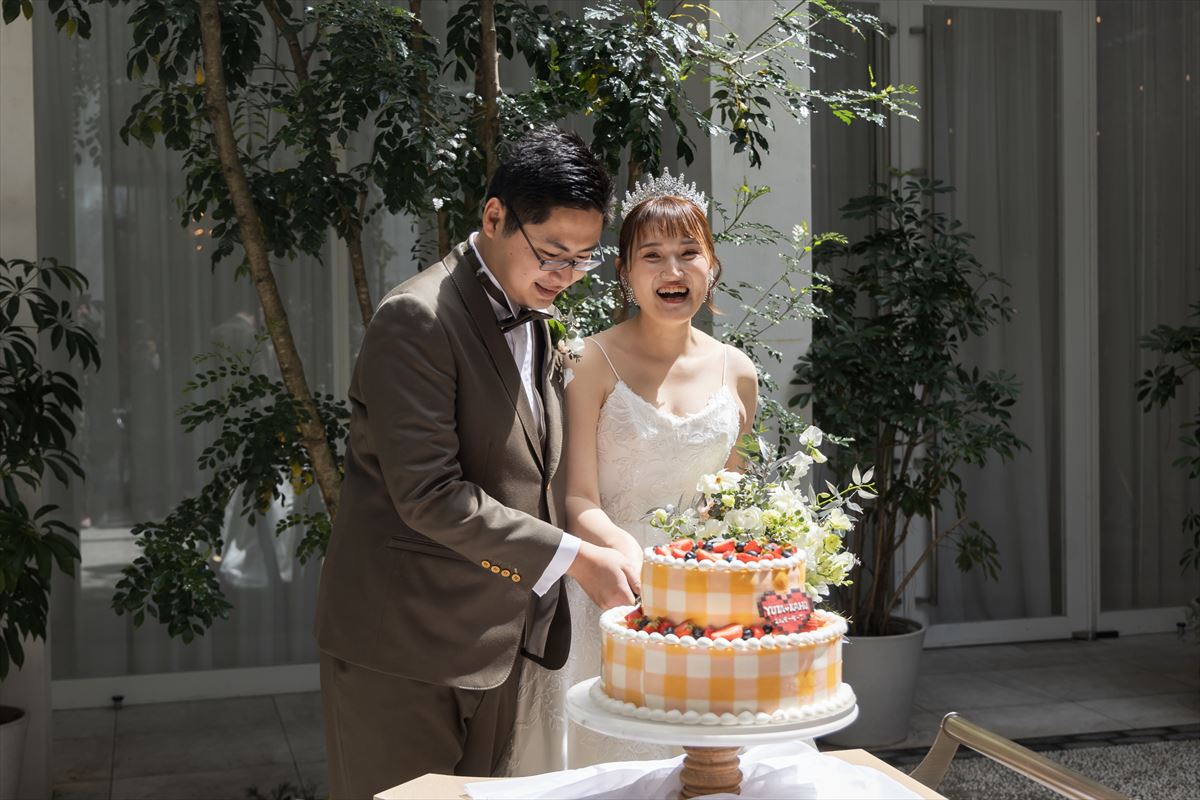絵を描くお仕事をしているかほさんは、会場の装飾や手作りアイテム、装花を特にこだわっていらっしゃいました。かほさんがお好きな画家の作品をモチーフにした会場装花は、かほさんのセンスが光り圧巻でした!また、席次表やエスコートカード、映像、招待状までもかほさんの力作です。そして、かほさんの学生時代からの夢だった「ギンガムチェック」のウエディングケーキは、パティシエと2人3脚で創った最高傑作です!