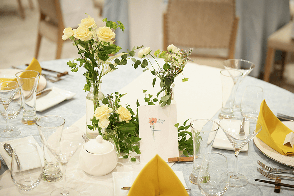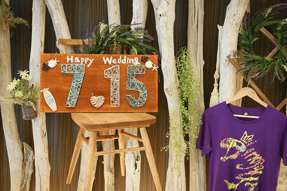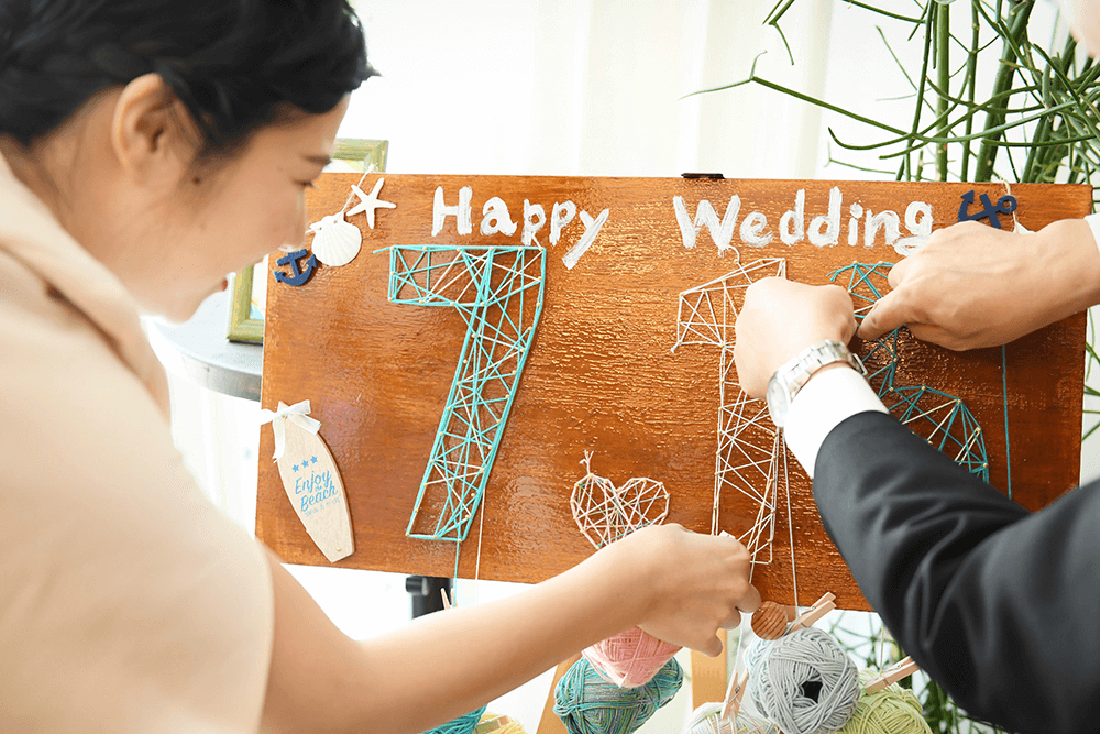 初めてお会いしたときから結婚式当日まであっという間でしたね。 会場見学の際には緊張していたおふたりが今では嘘のようにスタッフと仲良くなり、 名前まで憶えてくださって本当に嬉しく思います。おふたりが結婚式で大事にしたい想いをたくさん聞かせていただき、 形にすることができた日だったと感じています。 おふたりの大切にしている縁を紡いでいけるようにと願いを込めたストリングスアート、 「7月15日」をみんなで創っていく姿はとても素敵でした。