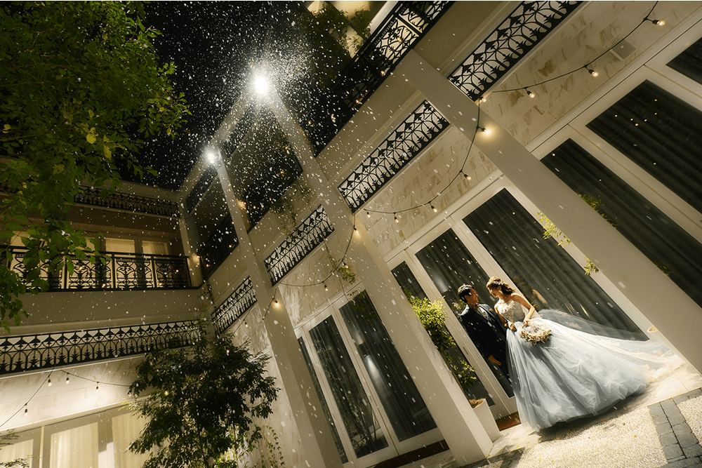雪が舞うようにスノーアレンジをした中庭や、横長のオリジナルウエディングケーキなどゲストの方にも喜んで頂けましたね。またいつでもラピスコライユに遊びに来てください。
