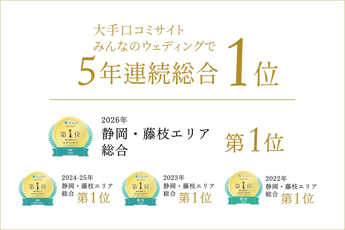 ラピスコライユは、みんなのウエディング「静岡・藤枝エリア」にて5年連続第1位受賞を果たしました。多くの新郎新婦の皆さまから高い評価をいただき、口コミ総合評価も4.6を超える結果に。口コミの内容はこちらからチェック!